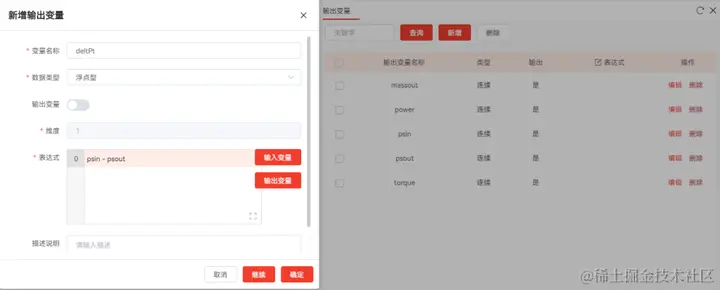 本案例的优化目标是要求总压差最大,压差由从文件读取的出口压降减去进口压降得到,该输出变量并非从输出文件中读取的,因此其添加方法也区别于从文件中提取的输出变量。在【变量设置】选项卡下输出变量列表上方单击【新建】按钮处选择【表达式变量】,在弹窗中填写变量名称和表达式后,即可创建该类型的输出变量如图18所示。