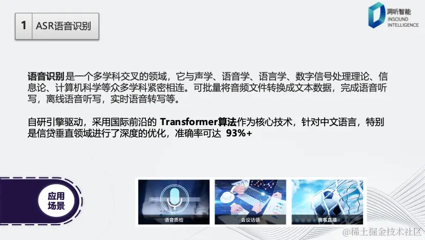 语音识别是一个涵盖多个学科领域的交叉领域,其中包括声学、语言学、语音学、数字信号理论等多个学科。洞听智能自主研发了语音识别引擎驱动,采用了国际领先的Transformer算法,这种算法在准确率方面取得了显著成果,达到了93%以上的高准确率水平。