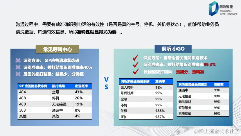 关键词识别在电话通信领域发挥着重要作用,其主要任务是确定电话的状态,包括关机、停机、无法拨通或正在通话等各种情况。传统客服中心通常使用SIP应答码方法,但其准确率较低,且分类数量有限。相比之下,洞听采用了自研的关键词识别技术,可以精准地识别多种状态,包括19个常见类别,因此提供更准确、更详细的拨打结果。