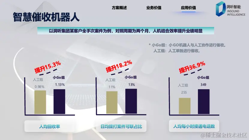 人均回收率提升15.3%,这表明小Go机器人与人工协同合作能够更有效地催收欠款。日均拨打案件可联占比提高18.2%,这意味着机器人的自动拨打和策略更具针对性,能够提高联系成功的机会。