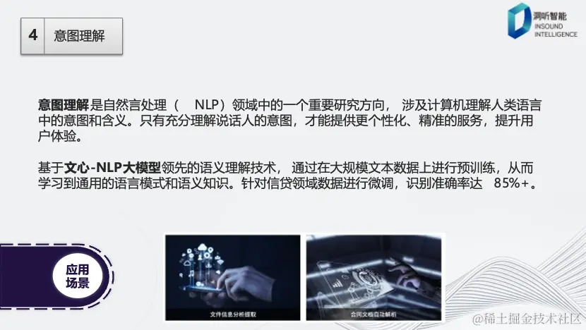 意图理解是自然语言处理领域中的一个重要研究方向,其目标是识别说话人的意图。通过深入理解说话人的意图,我们才能更有效地进行回复和互动。在这一领域中,采用了基于文心的NLP模型,该模型涵盖了约100多个不同的意图。值得注意的是,在信贷领域的数据识别方面,准确率已经超过85%。