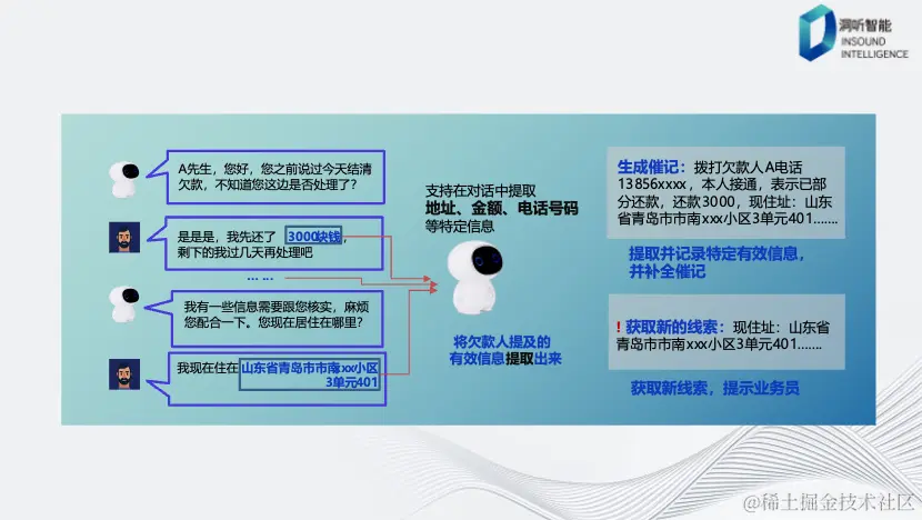 从文本中提取出地址、个人信息、还款金额以及电话号码等,然后这些信息将被自动整合成一条催记,以便管理人员随时查看。此外,每当机器人获取到新的信息时,系统还会生成一个新线索的提醒,以保证及时跟进和处理。
