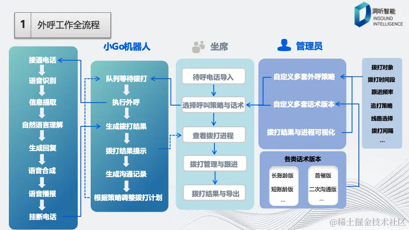 上图展示了外呼机器人的完整工作流程。首先,管理员根据拨打对象、拨打时间段、跟进频率、策略以及线路等信息进行管理,还可以定义多套话术版本。某些话术版本设置完成后,坐席将需要拨打的电话导入系统,并选择相应的策略和话术,即可开始拨打电话。之后,小Go机器人会接听电话,进行语音识别,提取对话信息,然后通过自然语言处理技术生成回复文本,最后通过TTS技术合成语音并进行播报,最终完成拨打。拨打结果也可以以智能数据看板的形式展示,方便坐席查看拨打结果并导出,以进行策略调整。