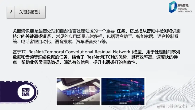 关键词识别是语音识别和自然语言处理领域的关键任务,其应用广泛,包括语音助手、智能家居以及汽车智能系统等。例如,智能助手Siri、小爱同学都在其中。洞听采用了基于时间卷积和ResNet的混合模型,结合了残差网络和时间卷积的优势,以提高效率和加快处理速度。
