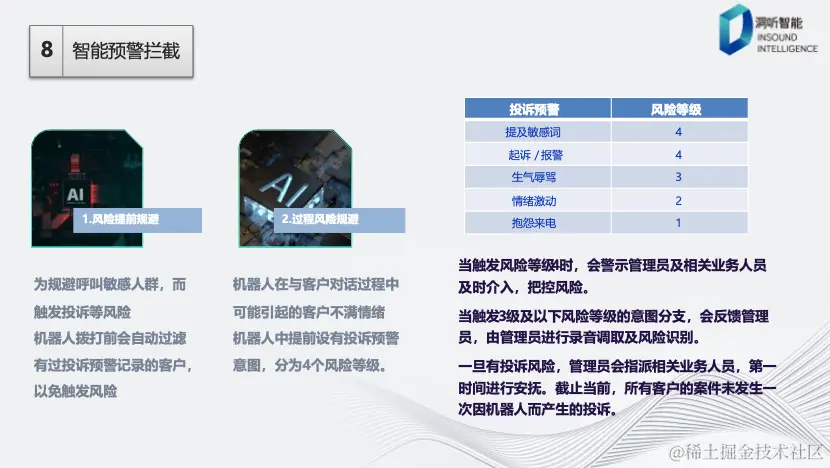 第一部分是关于风险预防以及在过程中如何规避风险。在呼叫中心拨打电话之前,我们会先检查对方是否有之前的投诉记录。如果有这样的记录,我们不会使用机器人自动拨打电话,而会由人工坐席来处理,以避免再次引发投诉。