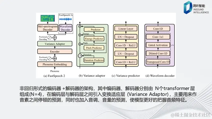 系统的架构采用了非回归式编码器和解码器的设计。编码器和解码器都由多个Transformer块组成,而且在Encoder和Decoder之间还包括了变换适应层。这个层的主要作用是将音频特征之间的停顿与音调、音量等因素相关联,从而使模型更好地捕捉音频的特征。