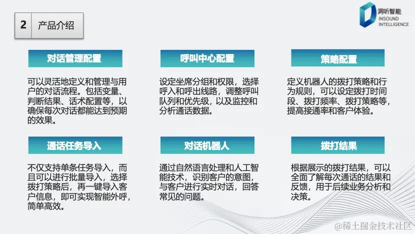总之,该外呼机器人产品提供了多个方面的灵活配置和功能,包括对话管理、呼叫中心配置、策略配置、通话任务导入、智能对话机器人等,同时通过数据看板展示结果,为用户带来了高效、智能和便捷的外呼体验。