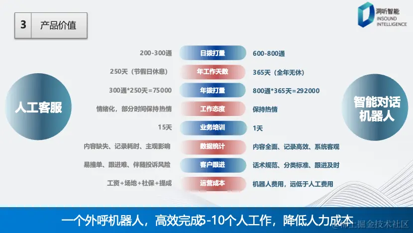 通过比较人工客服与智能机器人,在拨打量方面,机器人表现出远超人工的优势。一个智能机器人每天能够高效地完成相当于5~10名人工客服的工作量,从而降低人力成本。