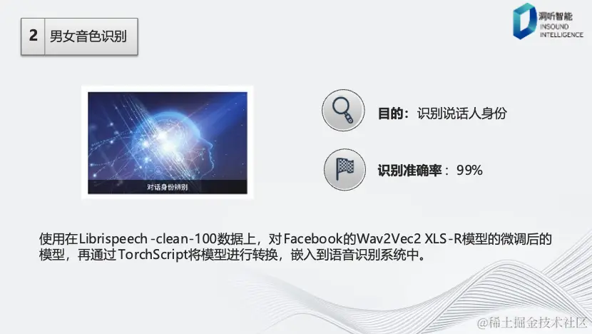 男女音色识别的主要目的是为了识别说话人的身份。为何不采用声纹识别的主要原因是,面对每天海量的音频数据,会导致高额的存储成本。因此,选择了男女音色识别作为解决方案,以应对债务人信息识别的需求。该模型基于Librispeech数据集,使用Facebook的Wav2Vec2模型,并通过TorchScript将模型转化为C++框架,嵌入到语音识别中。该方案有助于提高通话识别和回复的准确性,从而增强用户体验。