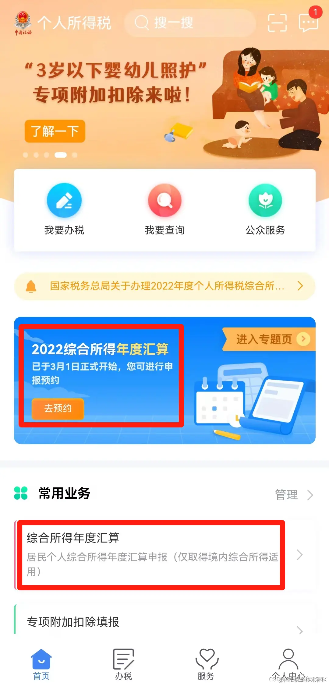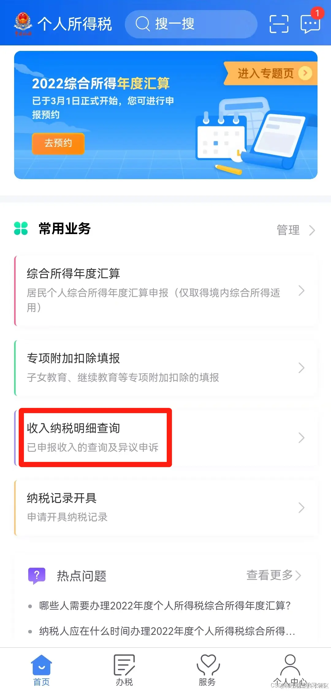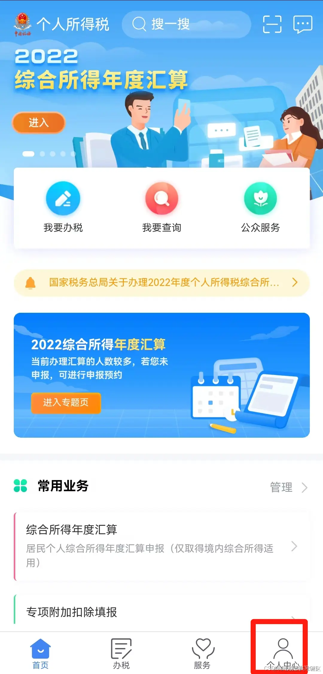接下来,我们介绍办理当日的流程。等到大家预约的日子,或者是到了不需要预约就能办理的03月21日后,大家打开软件并登录后,依然选择“综合所得年度汇算”即可。