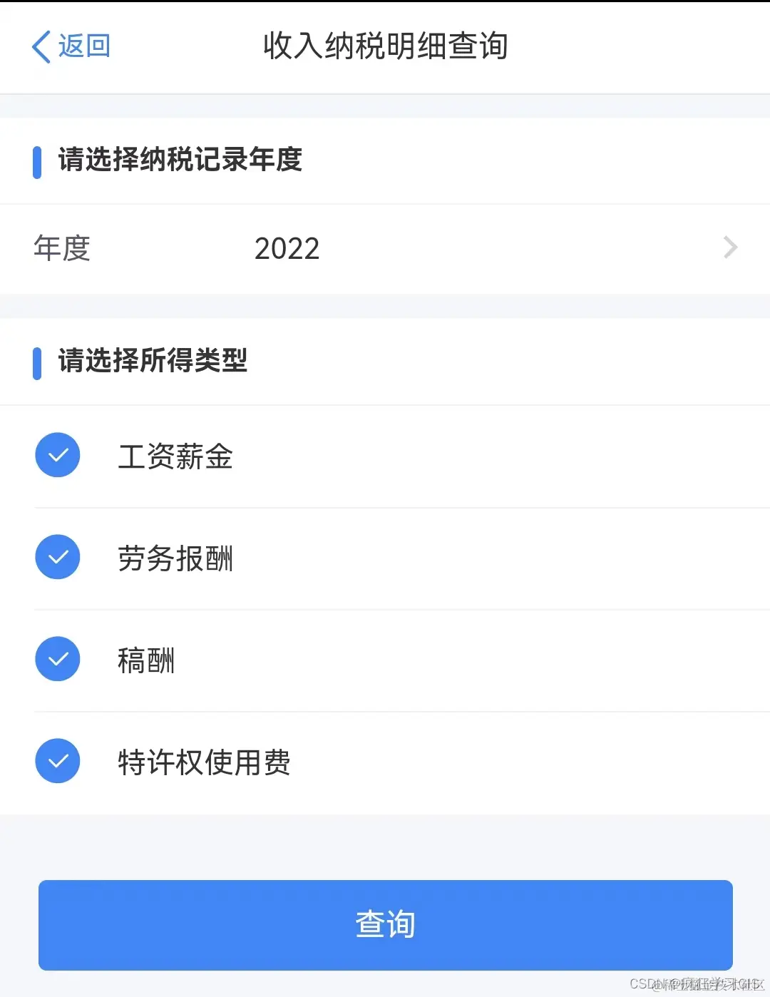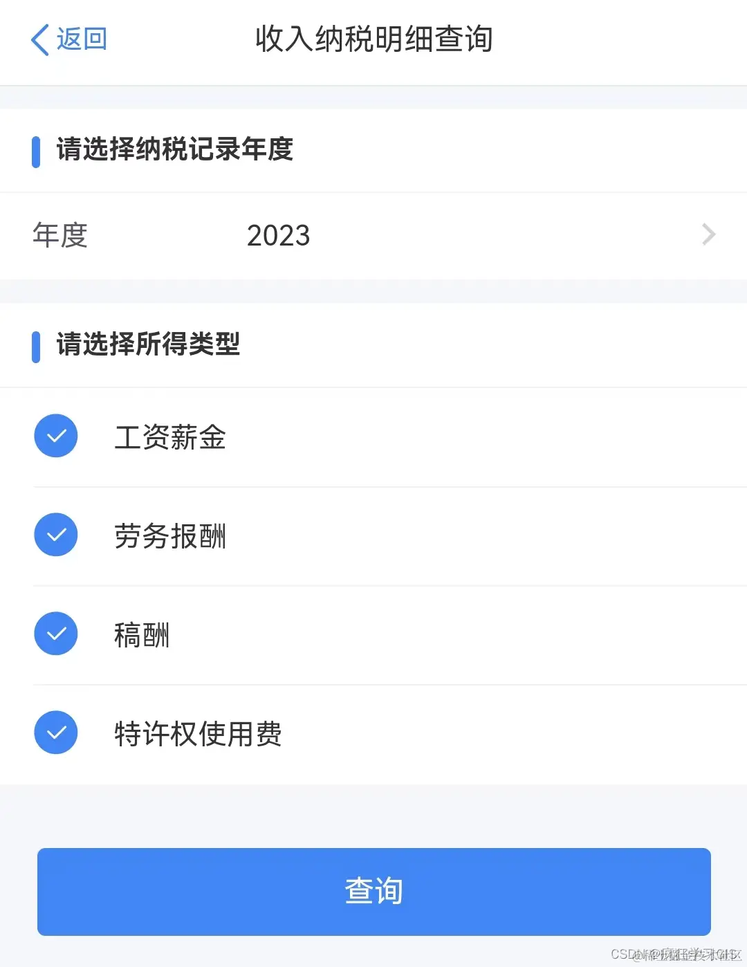 随后,选择我们希望查询的年份,并在下方的勾选项中选中全部内容。在这里,我们可以将所有能选择的年份都查询一遍,看看每一年的纳税情况。