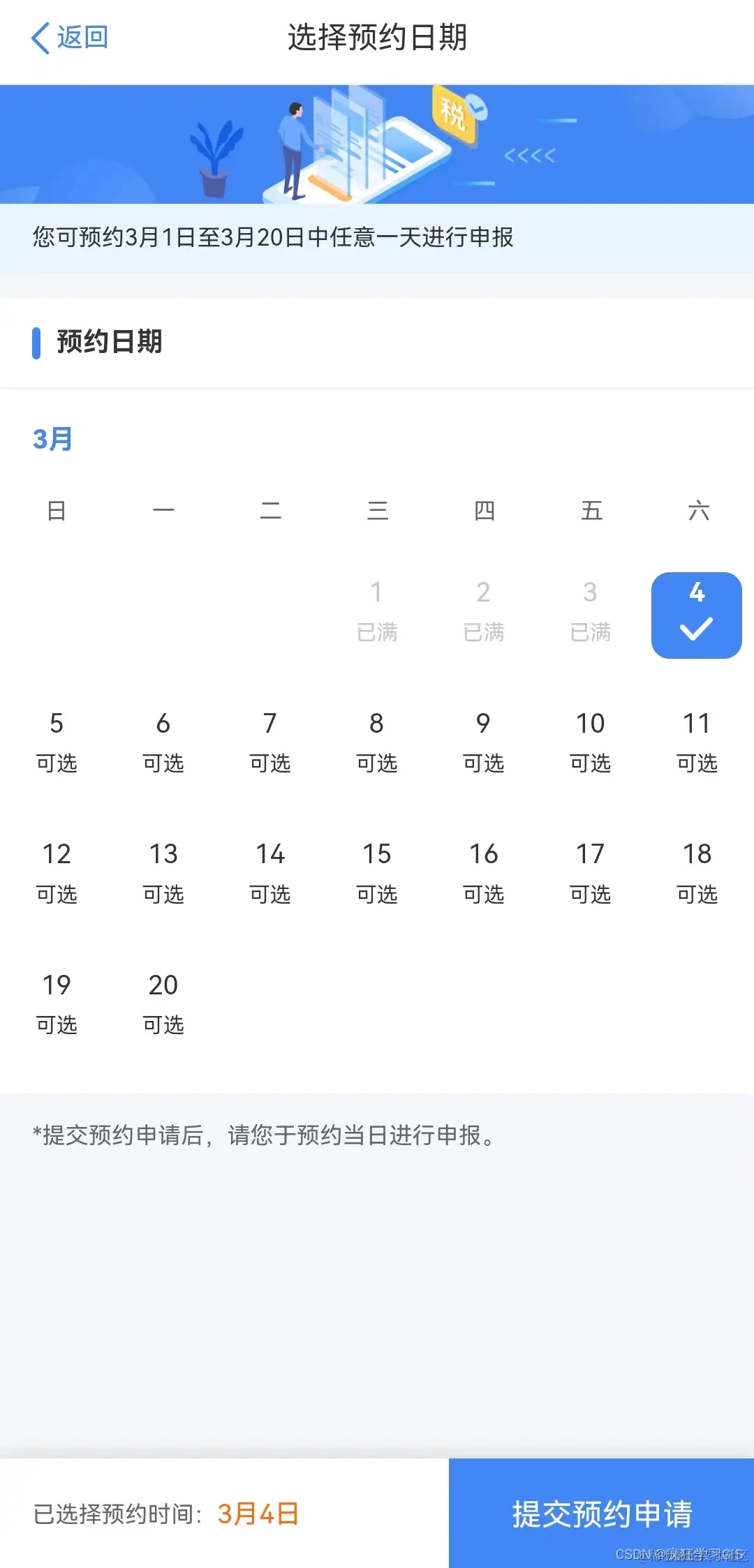 选择“开始预约后”,选择一个日期即可。这里建议大家就选择当前可选的最早的日期就行——例如,我当初预约时,3月前三天都被预约满了,因此就选择了03月04日办理。