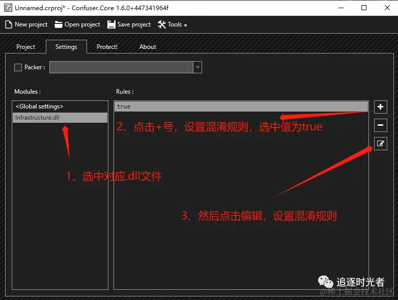 注意:这里与.dll文件设置混淆规则不一样,需要要设置Packer,压缩打包,且不需要编辑规则。