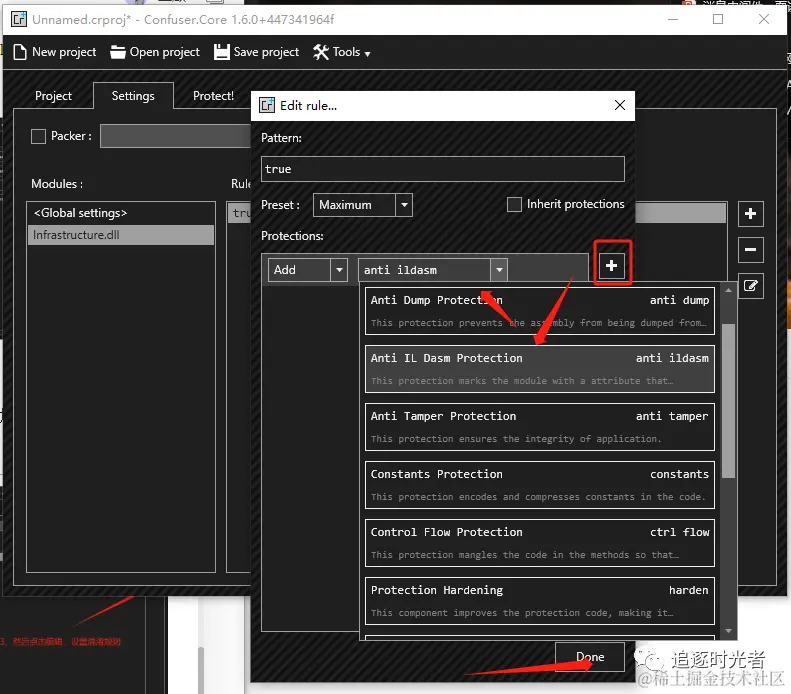 设置混淆规则:Protections选择anti ildasm,应该是防止IL反编译。因为Ildasm.exe是微软提供的.NET的IL反编译器。