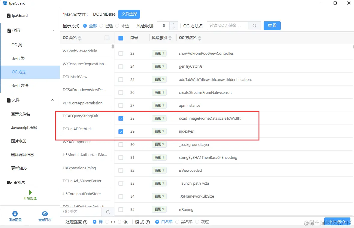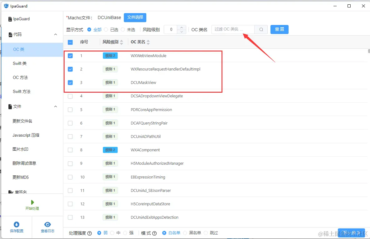 选择左侧代码模块下的oc方法或者swift方法,点击右侧的选择文件选取一个可执行二进制文件,勾选需要混淆保护的方法和函数。ipaguard提供了风险等级过滤,名称搜索过滤,根据类名称过滤条件来辅助配置混淆目标