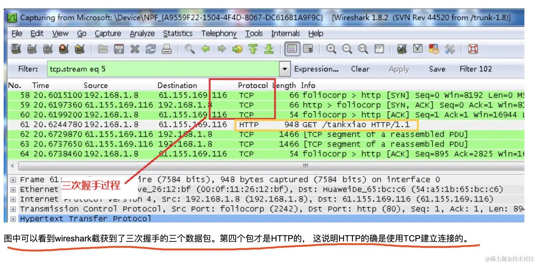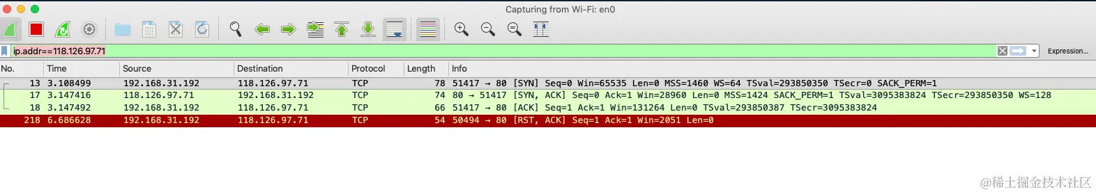 打开Wireshark,在过滤器中键入ip.addr==118.126.97.71, 访问www.dashen.tech[1],随后快速关闭.