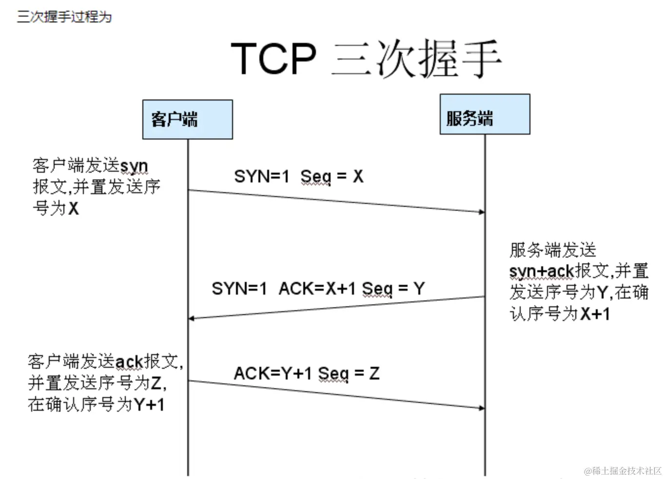 - 第二次握手:服务端收到 SYN 报文段后,向客户端发送一个 SYN-ACK 报文段,表示服务端同意客户端的请求,并要求客户端确认。