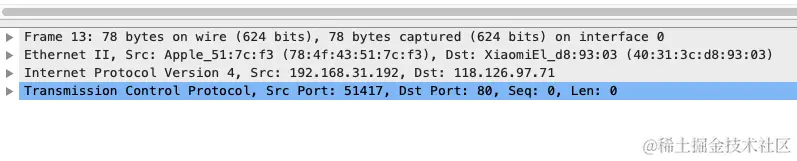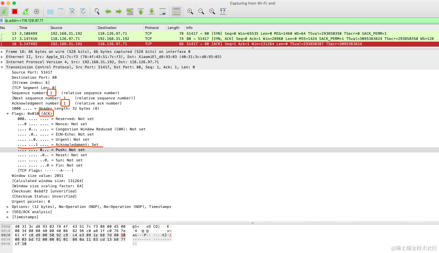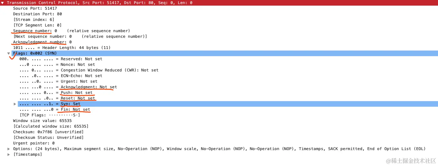 从标志位看出,同步位、确认位有值,在做应答(SYN+ACK):SYN 同步位为 1 、Acknowledgment 确认位为 1