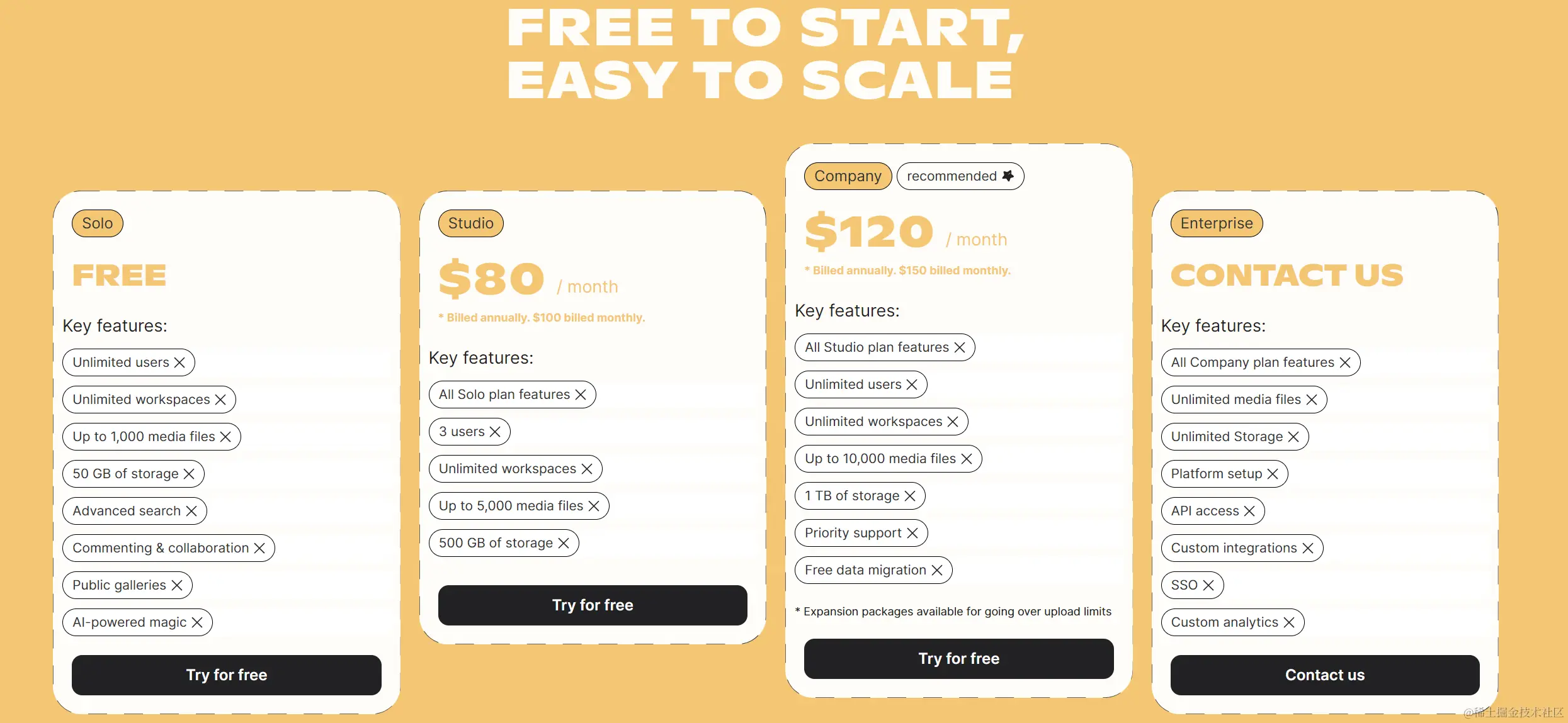 下面我们看看他的价格,因为主要面向的是B端,所以对于提供了面向个人的免费版本,和每个月120的订阅,以及更加定制的企业版本。协作类工具的不同价格之间的差别基本上都是在存储空间、协作人数上面。