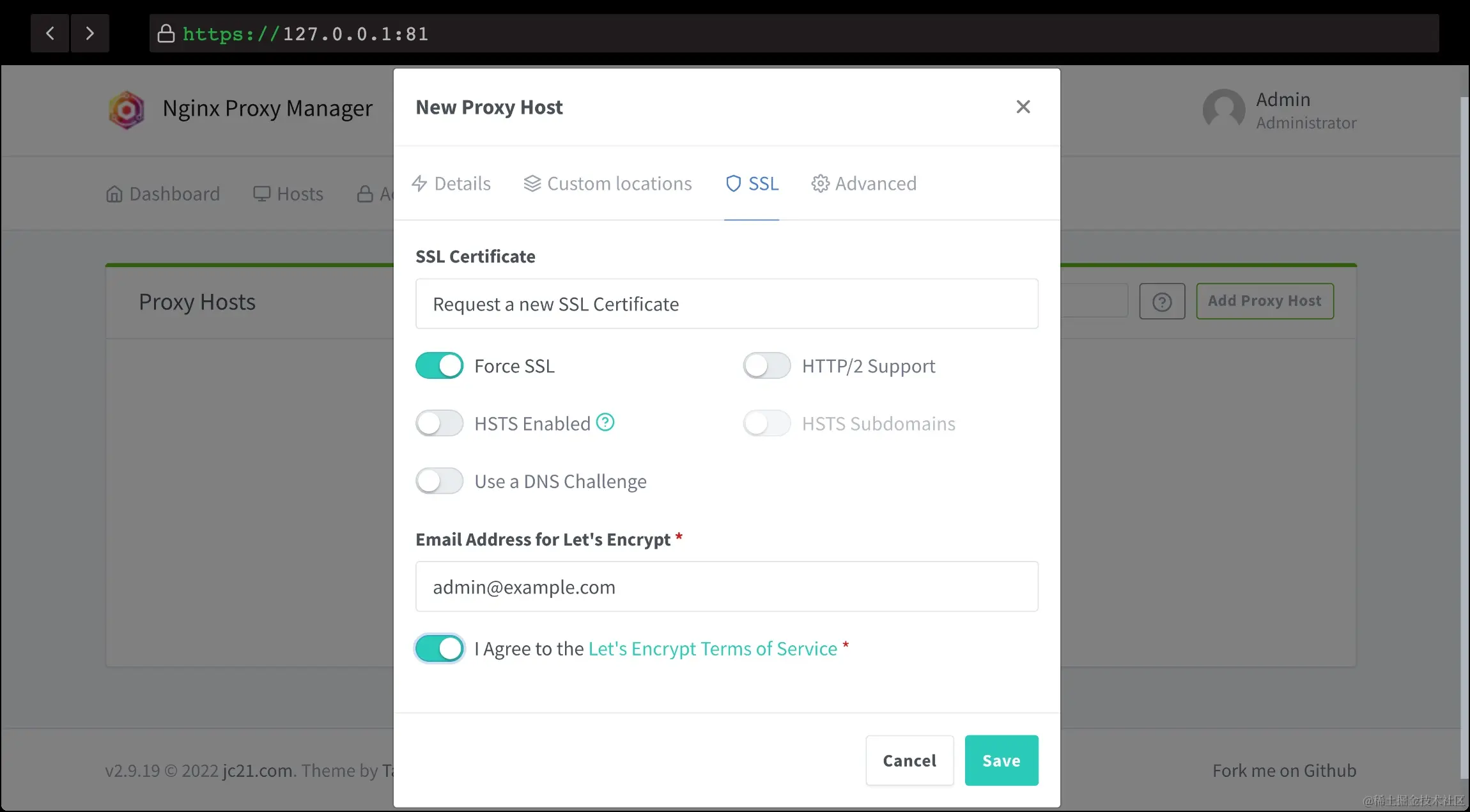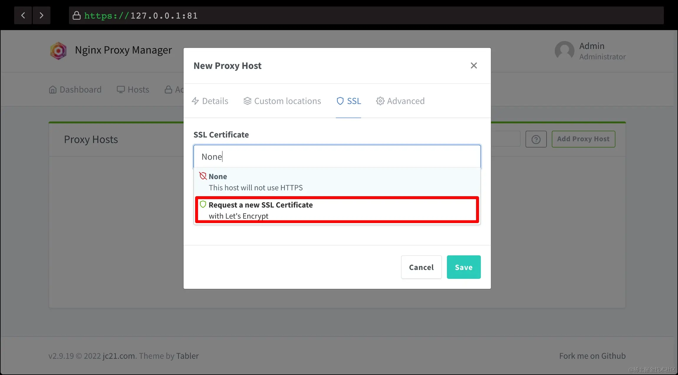 Nginx Proxy Manager 后台还可以一键申请 SSL 证书,并且会自动续期,方便省心。