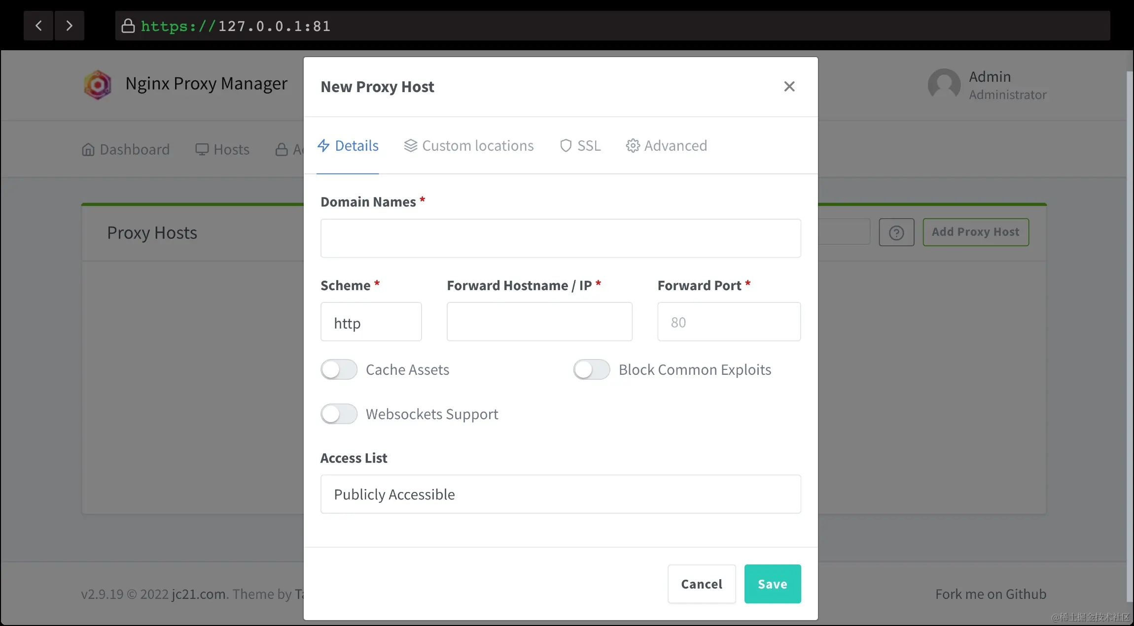 Domain Names:填我们网站的域名,首先记得做好 DNS 解析,把域名绑定到我们的服务器的 IP 上Scheme:默认http即可,除非你有自签名证书Forward Hostname/IP:填入服务器的 IP,或者 Docker 容器内部的 IP(如果 NPM 和 网站搭建在同一台服务器上的话)Forward Port:填入网站映射出的端口,这边默认是8090Cache Assets:缓存,可以选择打开Block Common Exploits: 阻止常见的漏洞,可以选择打开Websockets Support:WS 支持,可以选择打开Access List: 这个是 NPM 自带的一个限制访问功能,这边我们不管,后续可以自行研究。