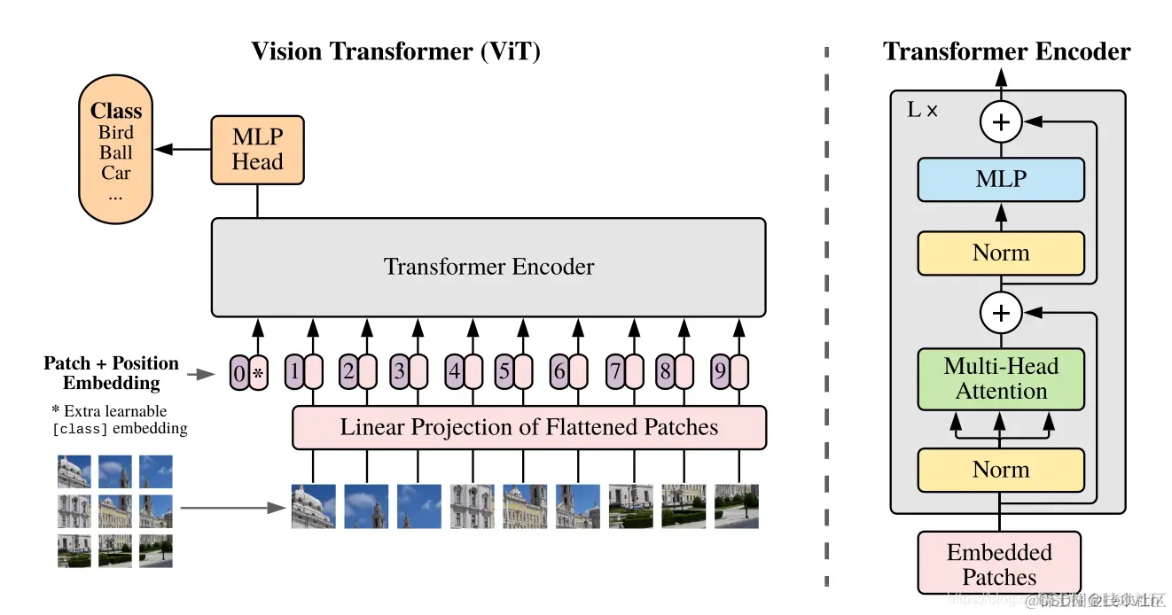 (3)之后会在序列开头添加一个特殊的嵌入向量,是<CLS>,这个嵌入向量没有其它意义,只代表输出的这个位置的嵌入,应该计算为整个图像的类别嵌入。