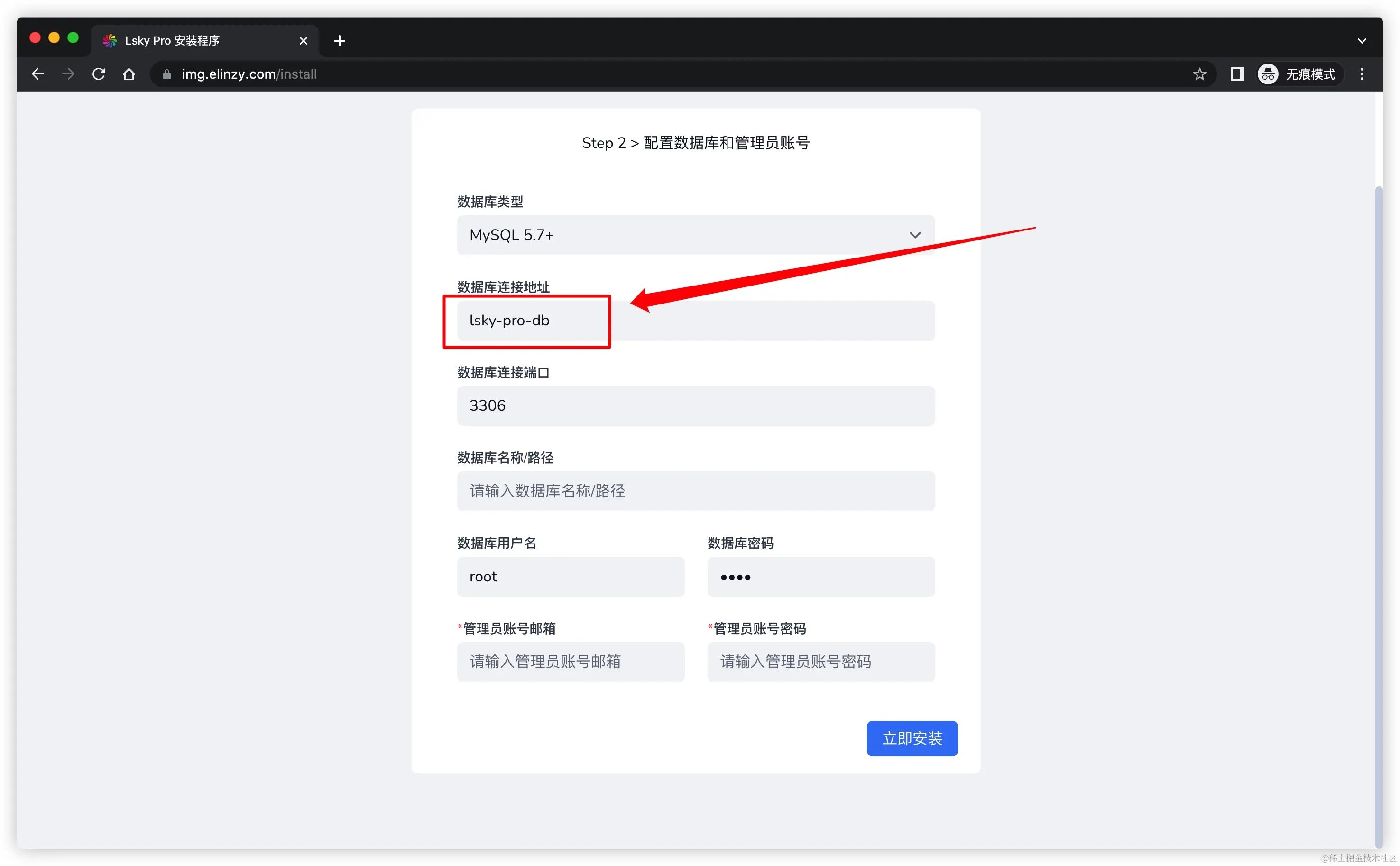 注意,数据库连接地址,填 docker-compose 文件里的容器名称 lsky-pro-db
