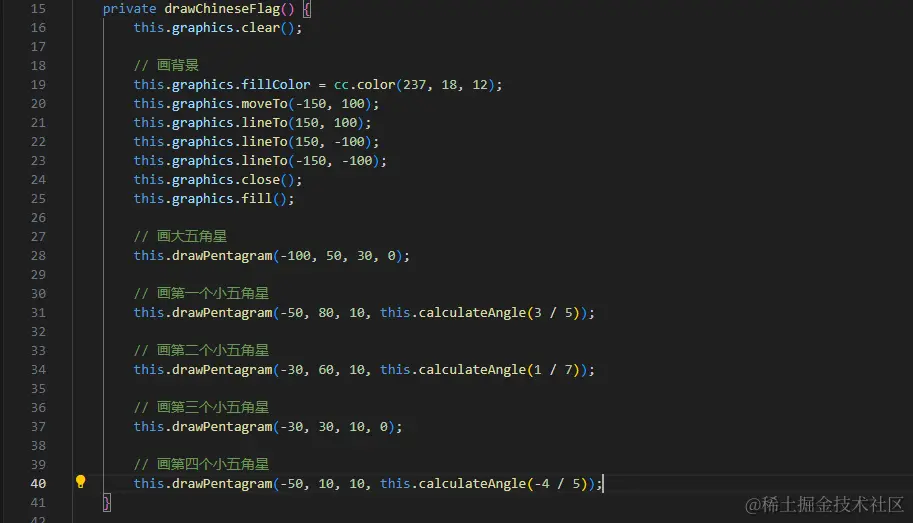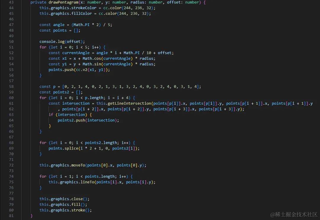 画五角星的核心代码,通过标准的方法确定五角星的五个顶点的位置,并且通过他们的连线确定他们的交点。然后依次连接所有的点形成五角星。