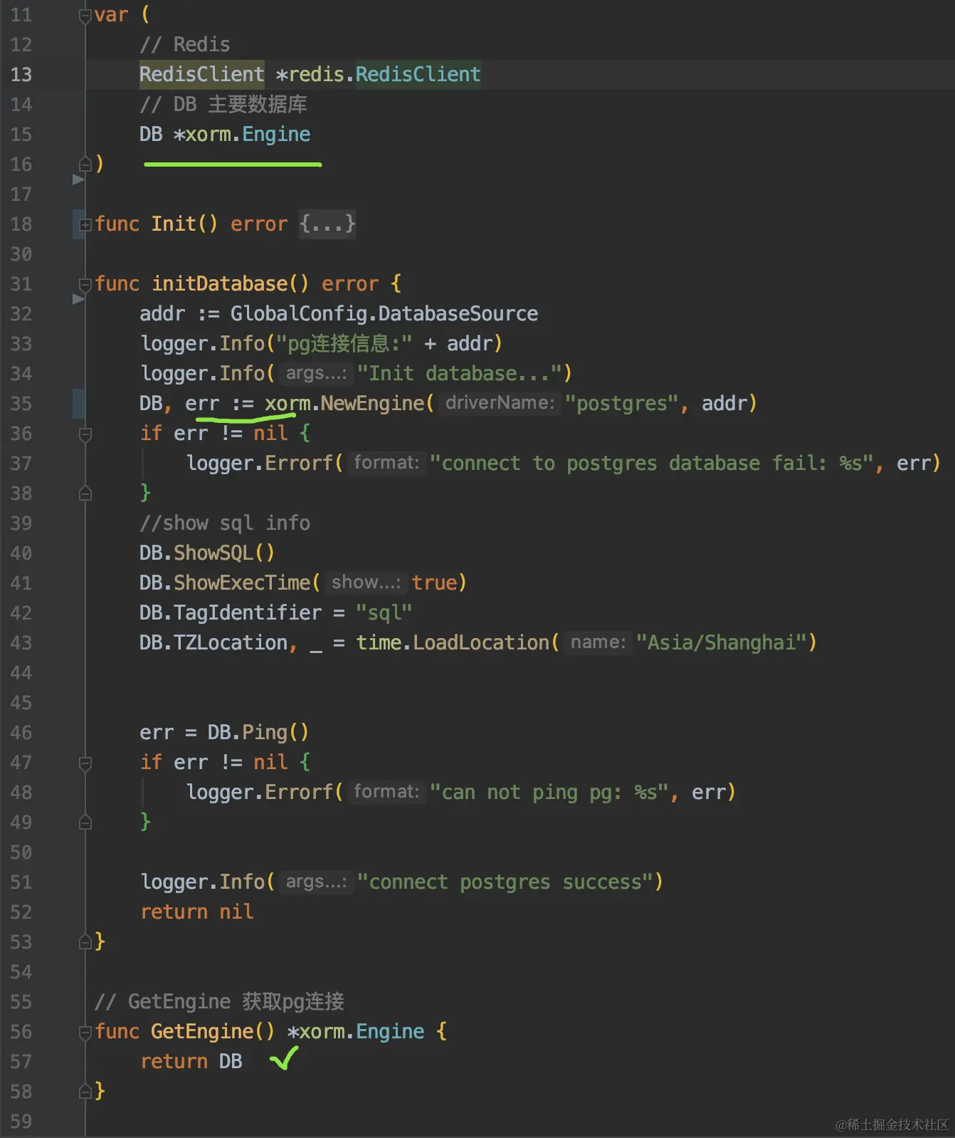 而最后调用GetEngine方法,返回的DB,还是最开始定义的那个全局变量,其并未经过initDatabase的赋值操作,故而还是初始化时的值.