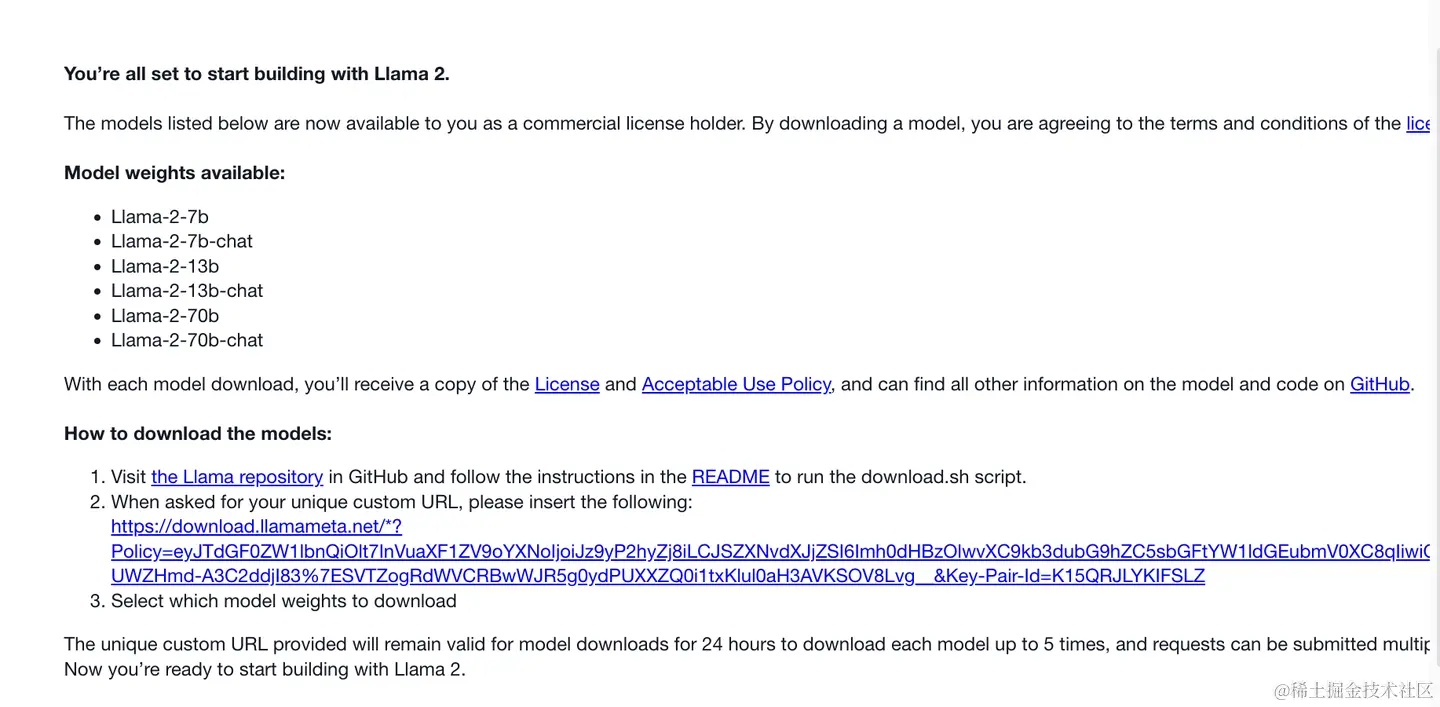 LLama2相关权重进行了开源,可以直接去Meta官网进行申请,填写邮箱后会收到一个链接。
