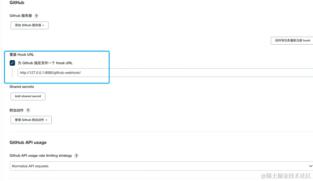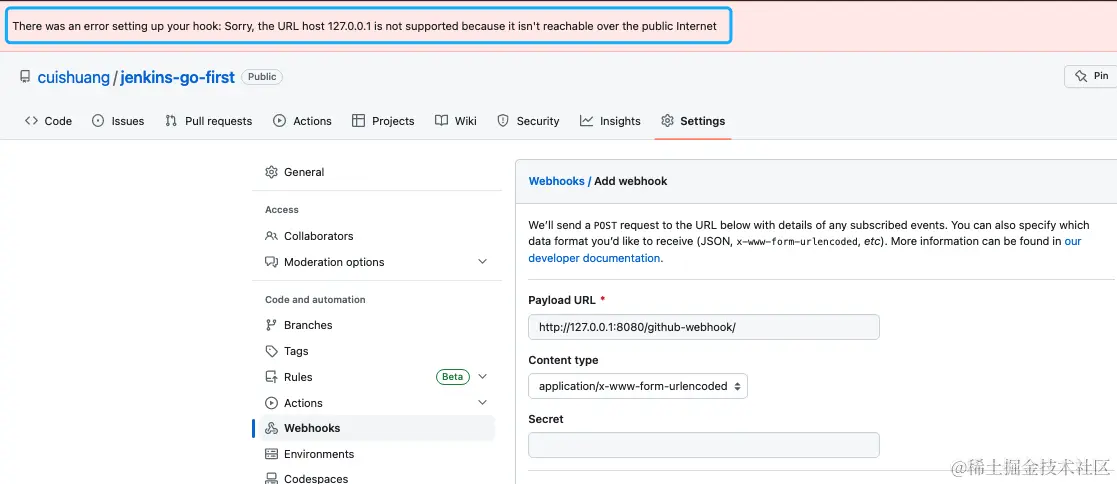 在github对应仓库的设置中,配置webhook,填入该地址