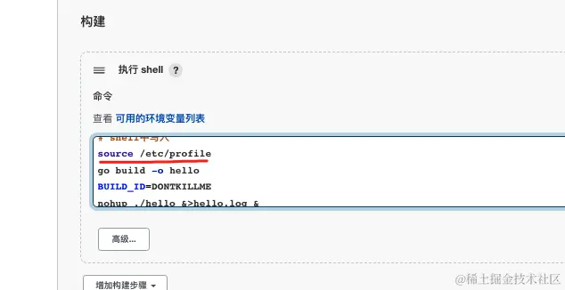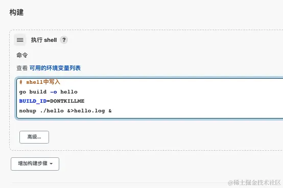 推荐将写在Jenkins上面 执行Shell的内容 写入到deploy.sh中,并推动到Github仓库,成为项目的一部分(这个deploy.sh脚本仅用于构建),而后将Jenkins 执行Shell的输入框改为bash ./deploy.sh