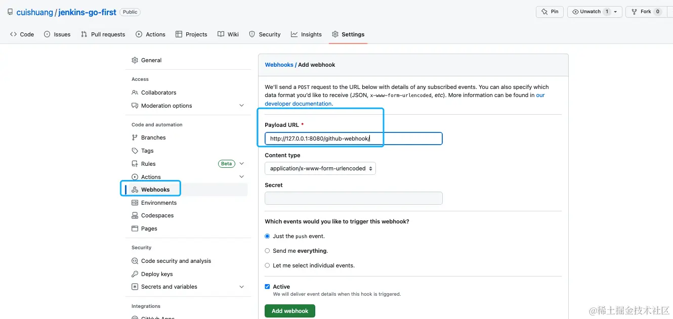 记录好webhook的地址: http://127.0.0.1:8080/github-webhook/