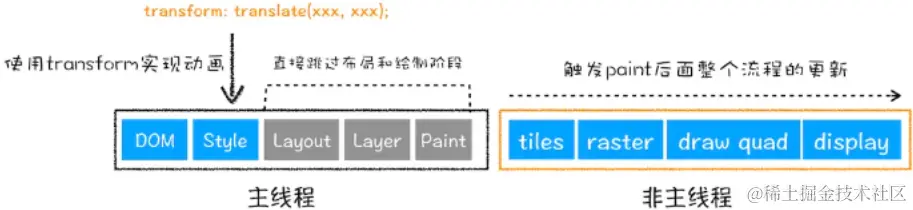 从上面的对比可以看出,我们使用了CSS的transform:translate来实现动画效果,这可以避开重排和重绘阶段,直接在非主线程上执行合成动画操作。这样的效率是最高的,因为是在非主线程上合成,并没有占用主线程的资源,另外也避开了布局和绘制两个子阶段,所以相对于重绘和重排,合成能大大提升绘制效率。其实这就是硬件加速