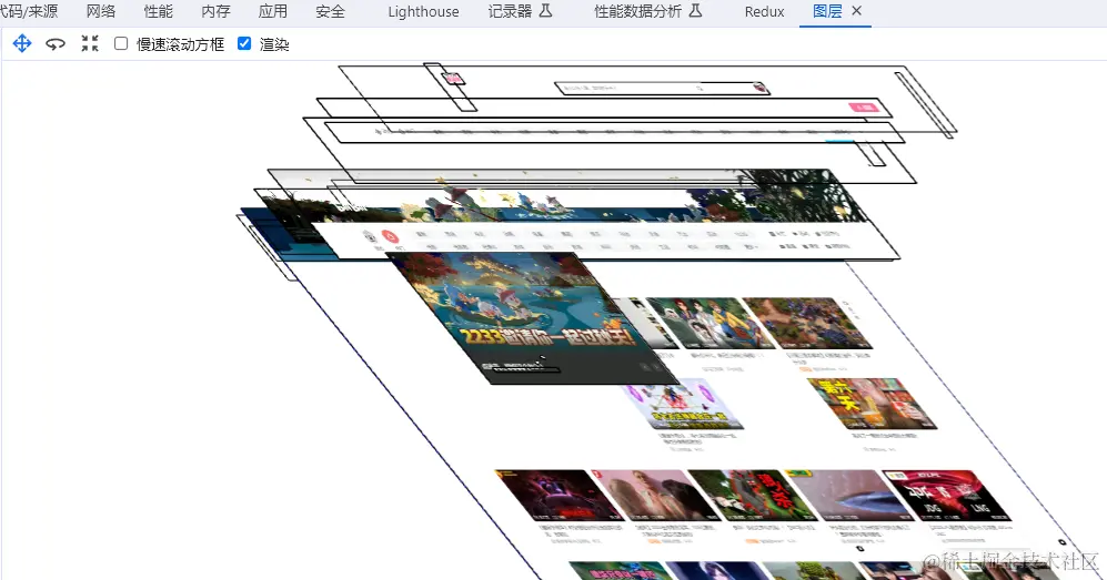 以B站举例,打开浏览器调试工具的图层,可以发现网页被切割为一块块图层。