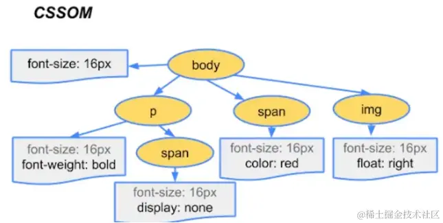 - 同时对于一些通过 CSS 隐藏的节点,也会从渲染树中省略。比如,上述 HTML 中的 span 节点在上面的例子中会在渲染树中丢失,因为它明确的设置了