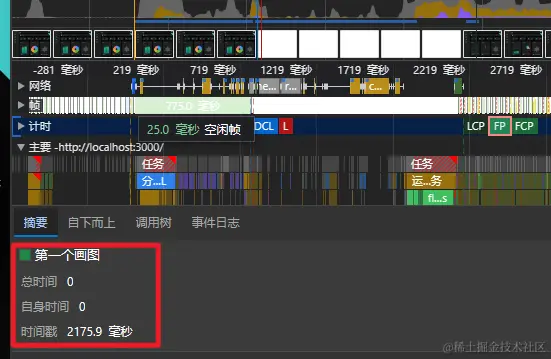 我们可以使用 performance 来录制分析我们详细的加载请求资源过程,其中我们可以看到 FP ,它在 FCP 的前面,即表示渲染出第一个像素点。也就是说它是我们 白屏时间 的一个结束位置。