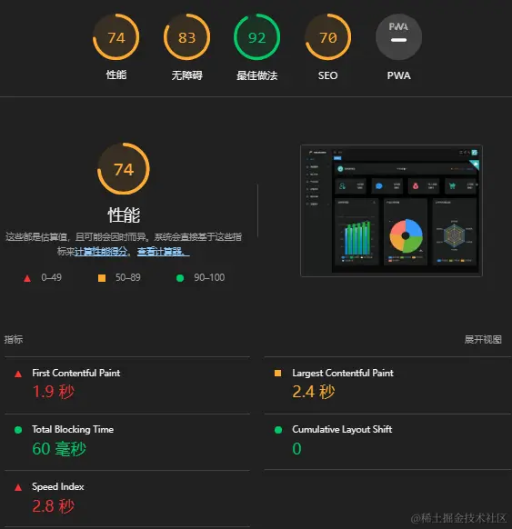 我们还可以在浏览器开发者工具中使用 Lighthouse 为项目体检一下,其中较为重要的就是 FCP,即当用户访问网页 到 浏览器开始将页面内容呈现给用户的时间,FCP 的值越小,表示页面内容首次呈现给用户的速度越快,用户感知的加载速度也会更好。因此,对于网页性能优化来说,降低 FCP 时间是一个重要的目标