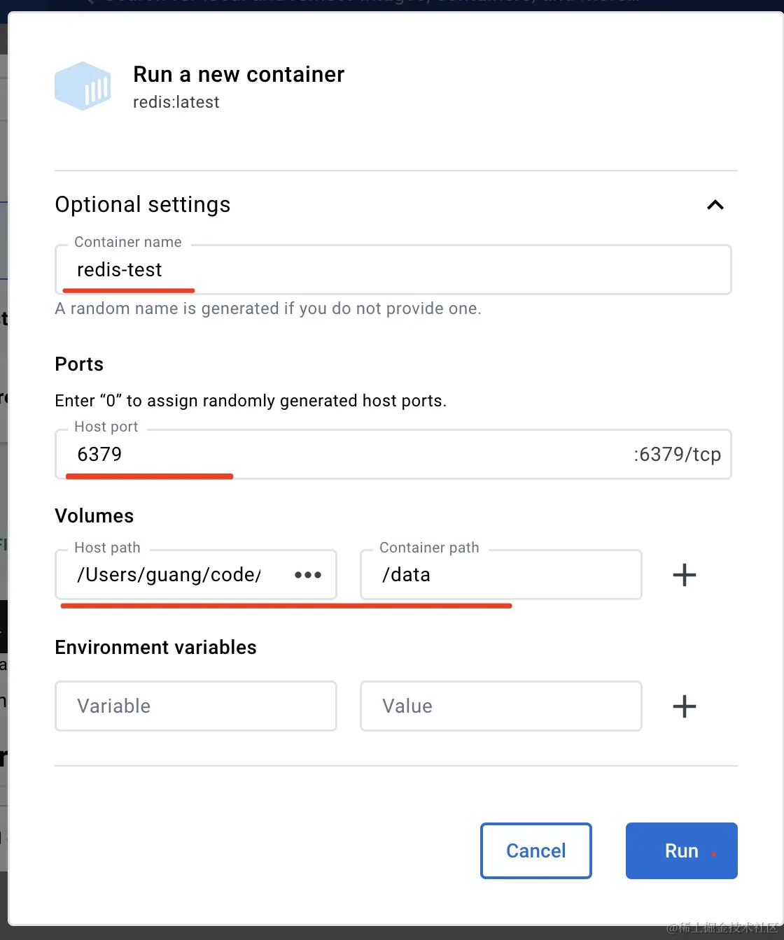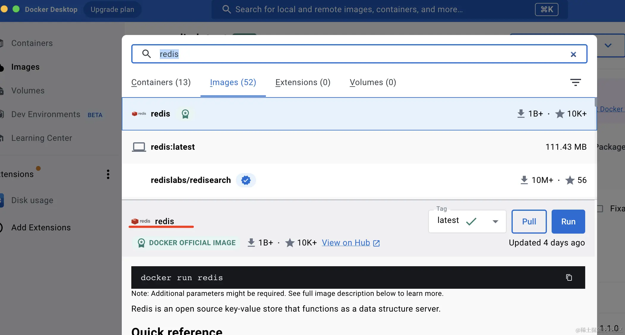 在 docker desktop 搜索框搜索 redis,点击 run,把 redis 官方镜像下载并跑起来(这步需要科学上网)。