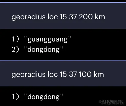 然后用 georadius 分别查找经度 15、纬度 37 位置的附近 100km 半径和 200km 半径的点: