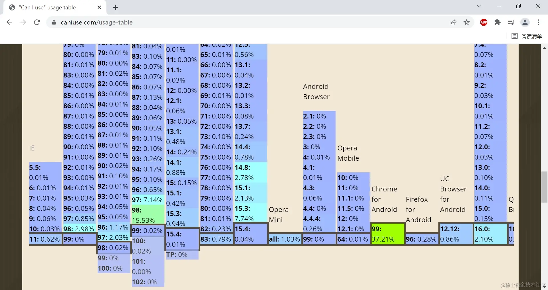 比如 chrome for Android 99版本的用户占比非常高,达到了 37.21%.