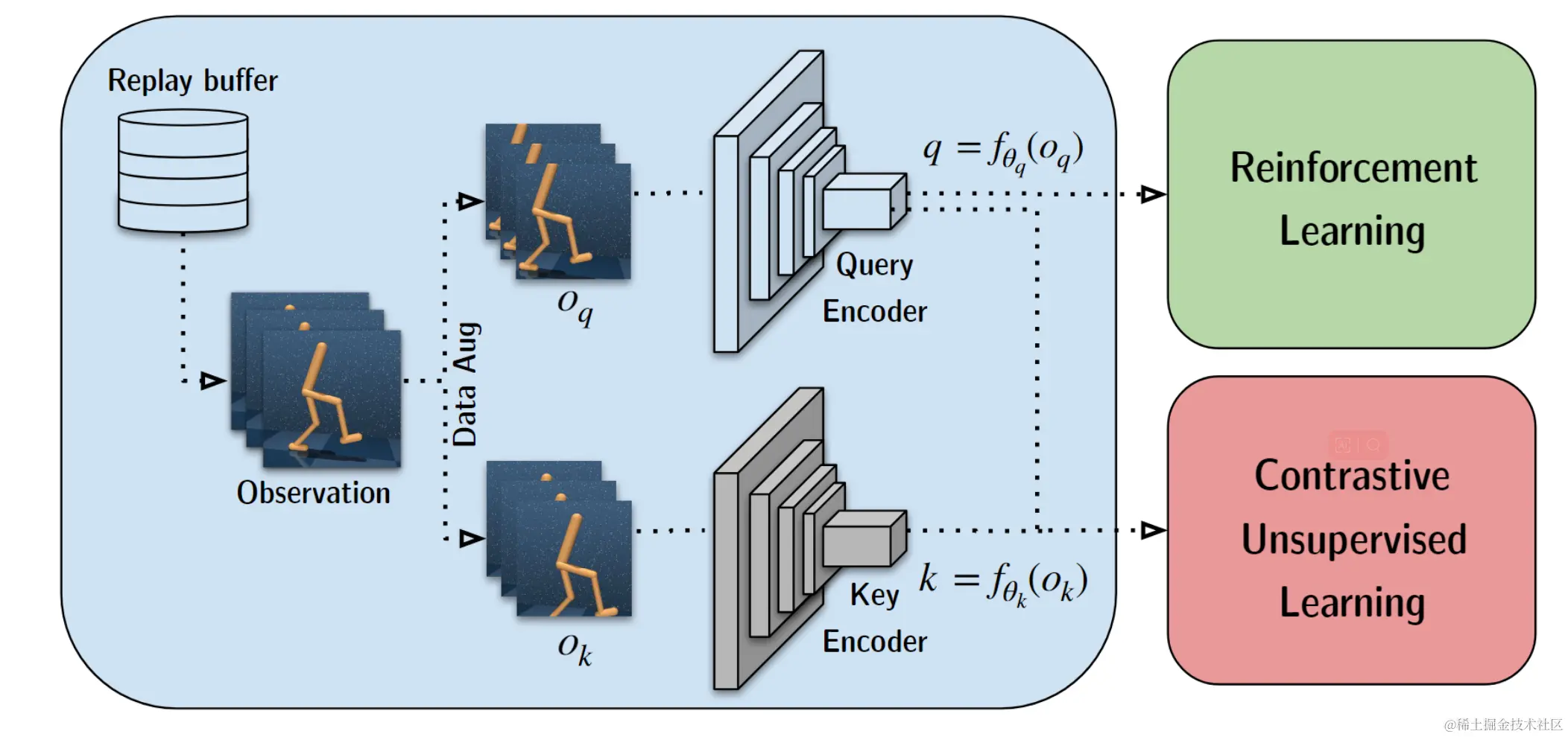 图 1. Contrastive Unsupervised Representations for Reinforcement Learning (CURL) 结合了实例对比学习和强化学习。CURL通过使用对比损失来确保观测 的数据增强版本 和 的嵌入匹配,从而训练一个视觉表示编码器。查询观测值 被视为锚点,而关键观测值 包含正值和负值,它们都是从RL更新采样的小批量数据中构造的。这些键是用查询编码器的动量平均版本来进行编码。强化学习策略和 (或) 值函数建立在查询编码器之上,该编码器与对比和强化学习目标联合训练。CURL 是一个通用框架,可以插入到任何依赖于从高维图像中学习表示的强化学习算法中。