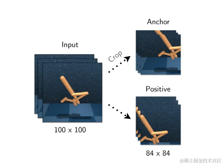 与图像设置中的实例区分类似,锚点和正样本观察是同一图像的两个不同增强,而负样本来自其他图像。CURL 主要依赖于随机裁剪数据增强,其中从原始渲染中裁剪出一个随机方块。