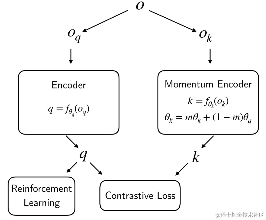 感觉这篇工作尝试将对比学习引入强化学习中来对原有的强化学习进行改进,借鉴对比学习的几篇经典工作,其对于 与 进行对比学习,并只使用 来进行强化学习以提升性能。