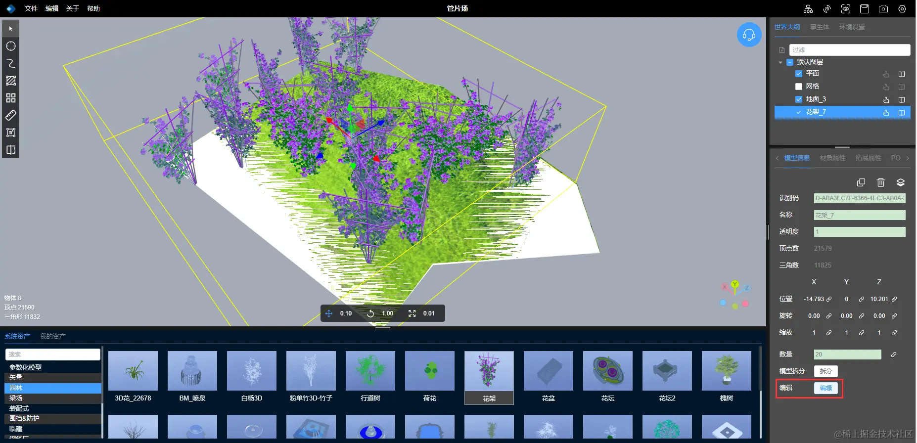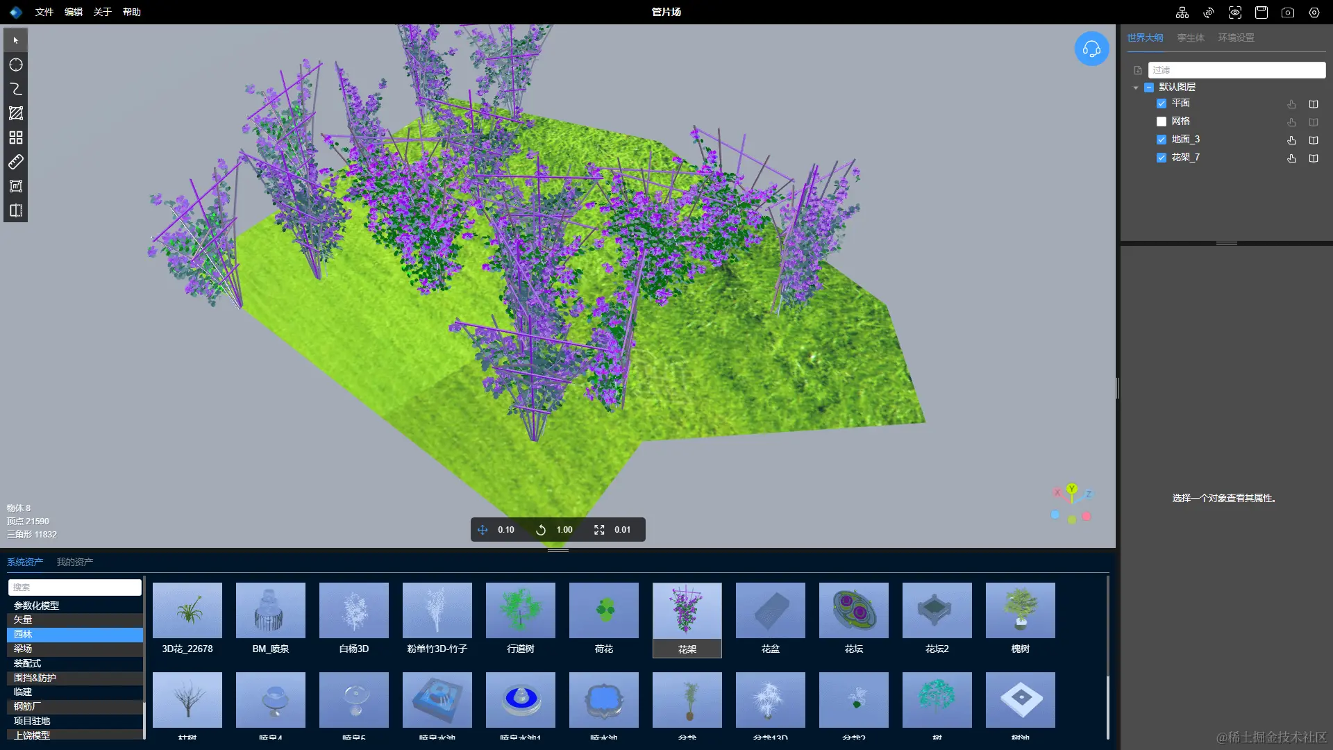 先选择花架模型资产,然后先绘制一个和草地大小、形状一样的不贵去区域,右键绘制结束,在草地上实时渲染了几个花架模型(默认是5个)。