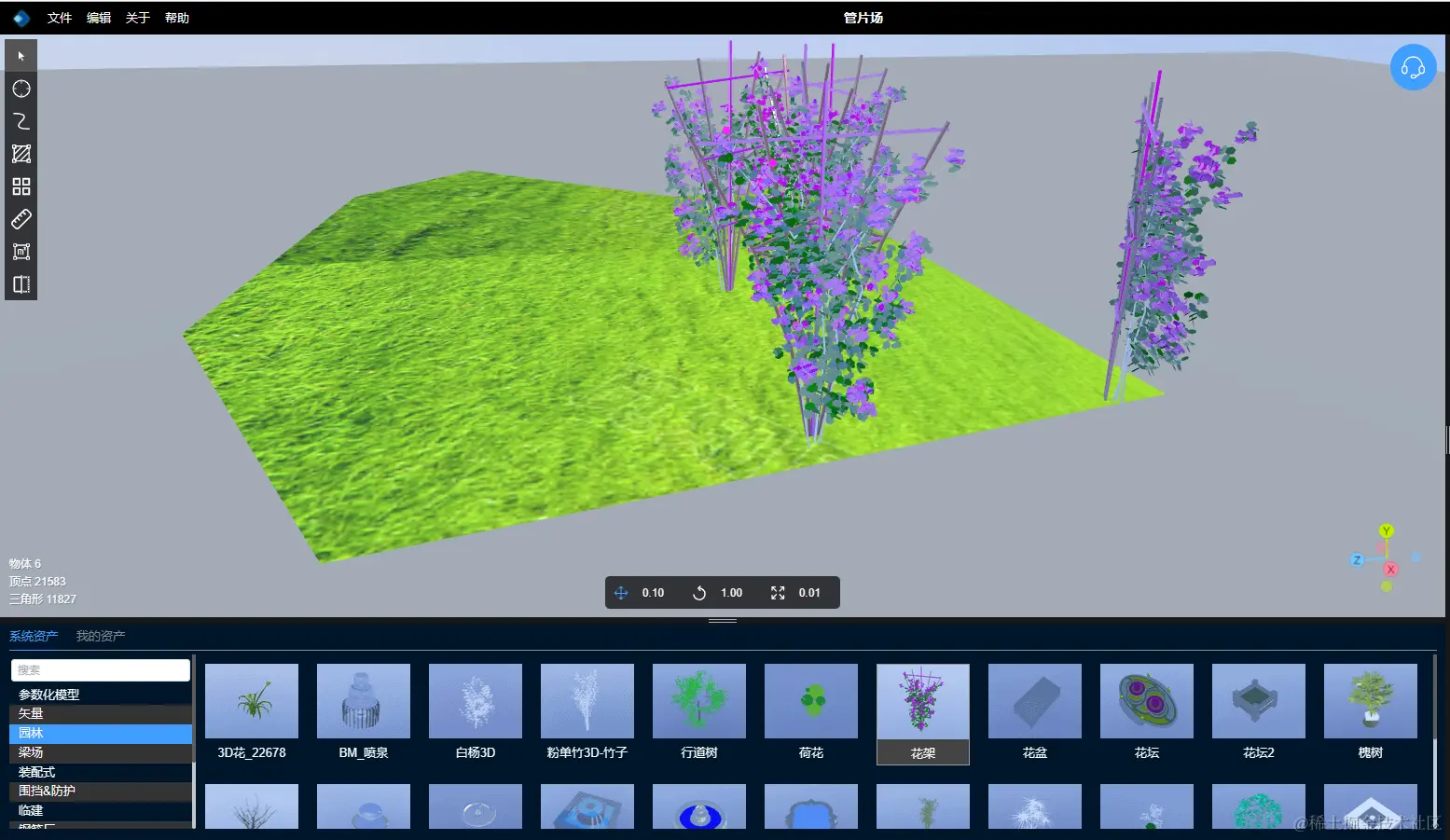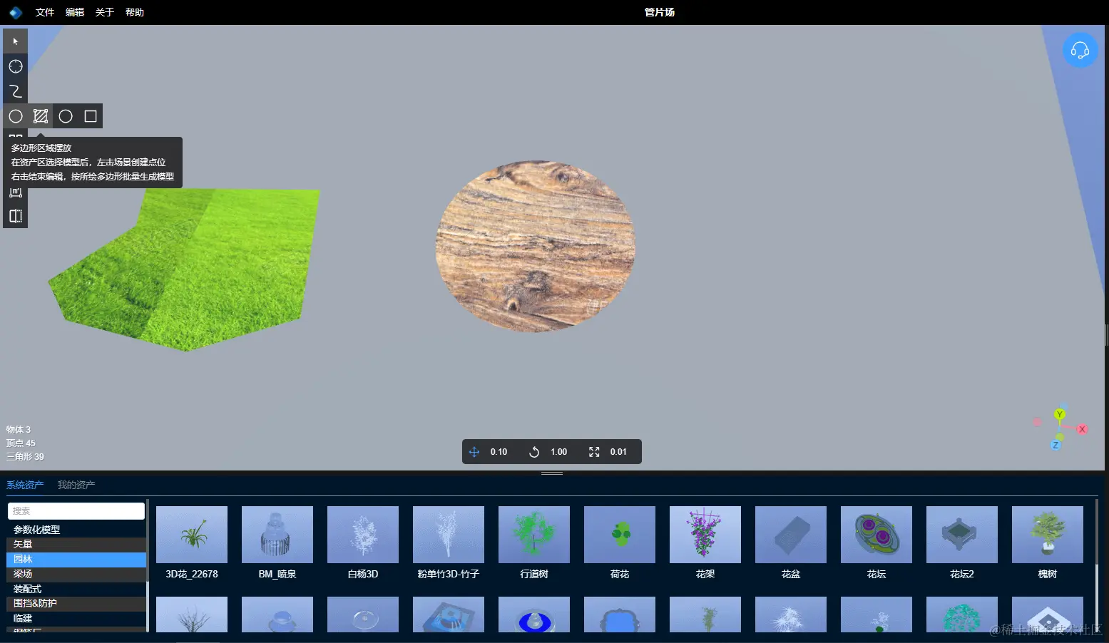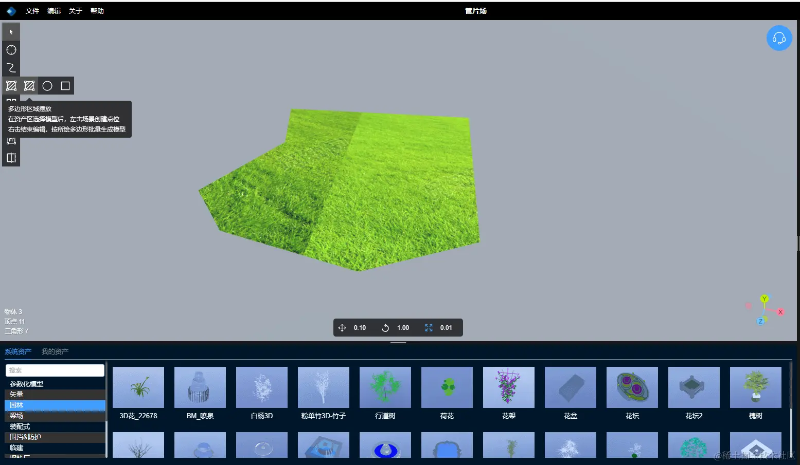区域绘制特点就是模型在区域内是随机分布的,是无规则的。有可能在这个区域中的左边部分模型资产分布绘多些, 右边部分会少些;有可能在这个区域中的上半部分模型资产分布绘多些, 下半部分会少些;也有可能是是其他情况,总之没有规则。还有就是,区域中绘制的模型资产之间的间距也是无法调整的。