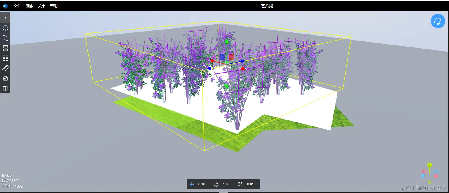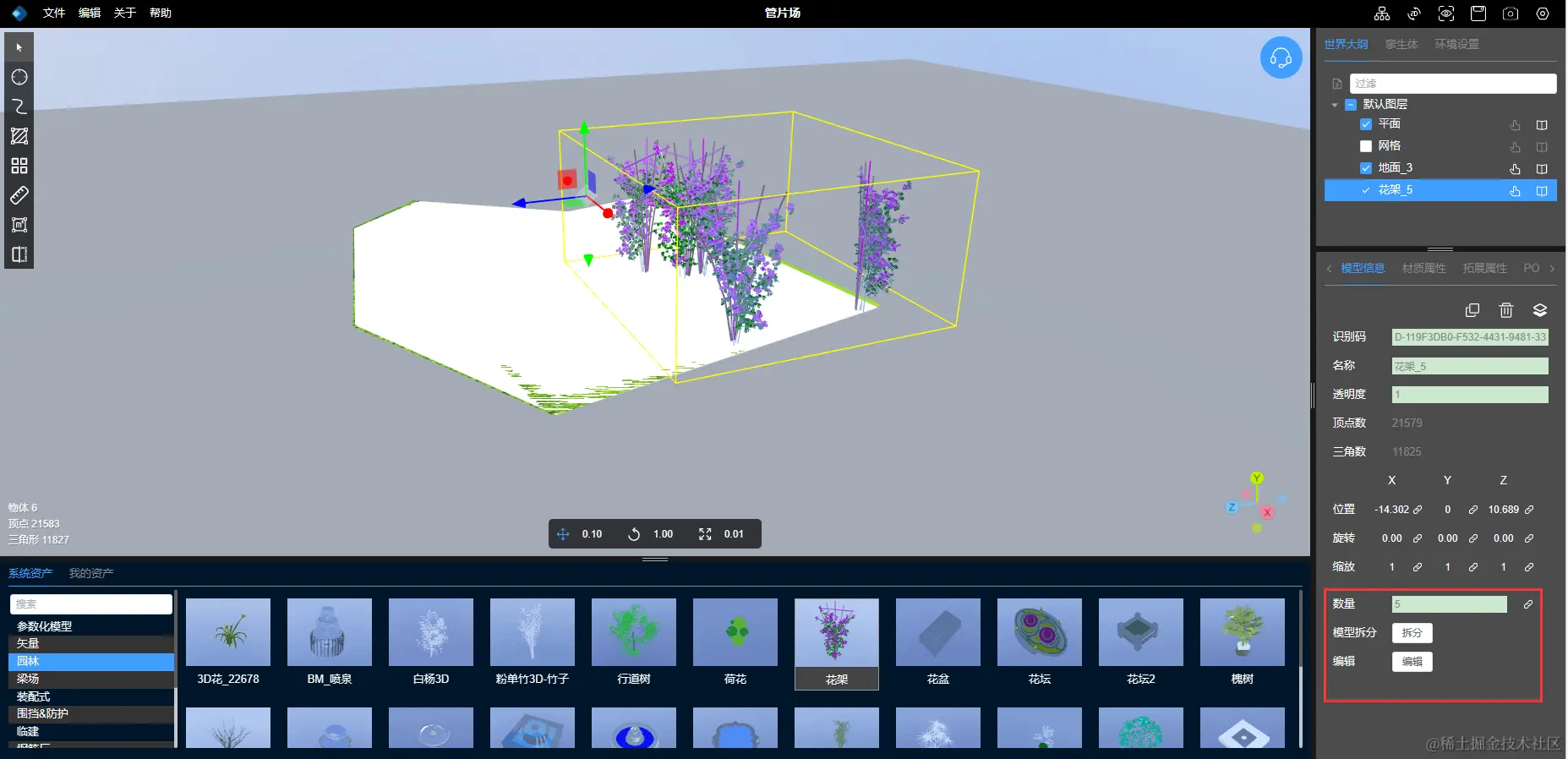 在场景中绘制资产时,除使用上述两个的方式外,NSDT 编辑器还支持使用区域绘制的方式进行绘制。先选取需要绘制的模型资产,然后选择区域绘制模式(区域绘制可以绘制矩形、圆形、不规则形状三种模式),选择好模式后,鼠标左键在场景中绘制区域,右键结束绘制。场景会在刚才绘制的区域中实时的批量绘制刚辞选定的模型资产。绘制完成后,还可以对该区域进行二次编辑,重新划定区域。也可以对该区域的模型密集值(该区域模型的数量)进行修改。