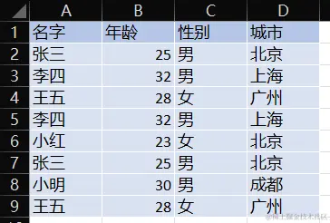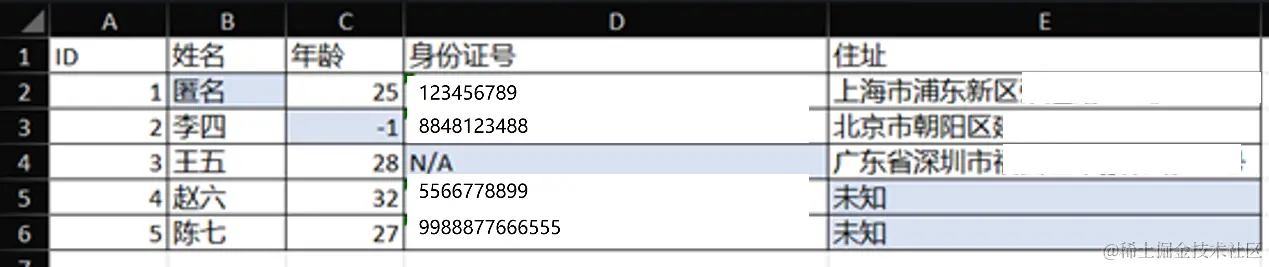 假如有一个Excel的数据,现在蓝色的格子是空的,我们需要对不同列下的蓝色格子做不同的处理,例如姓名的空格子替换为匿名,年龄替换成-1,身份证号填写N/A,住址填写为未知。