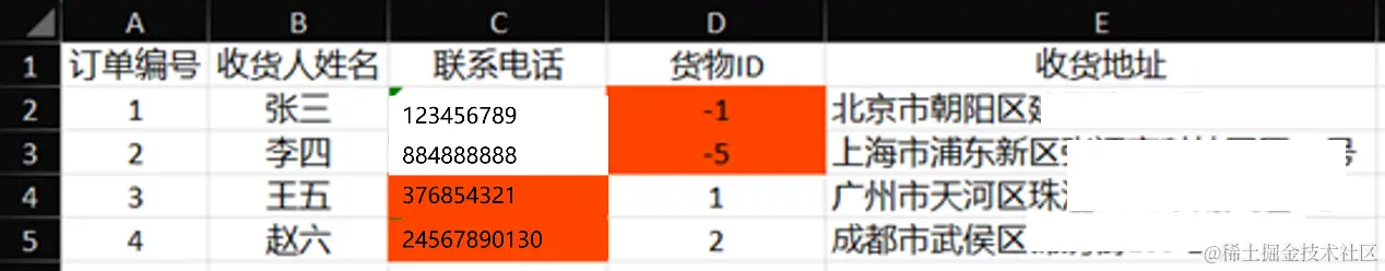 假如我们有下面一份数据,其中联系电话中有两条是错误的,位数不够,货物ID有两条是错误的,货物ID不能小于0,我们需要把他们找出来。