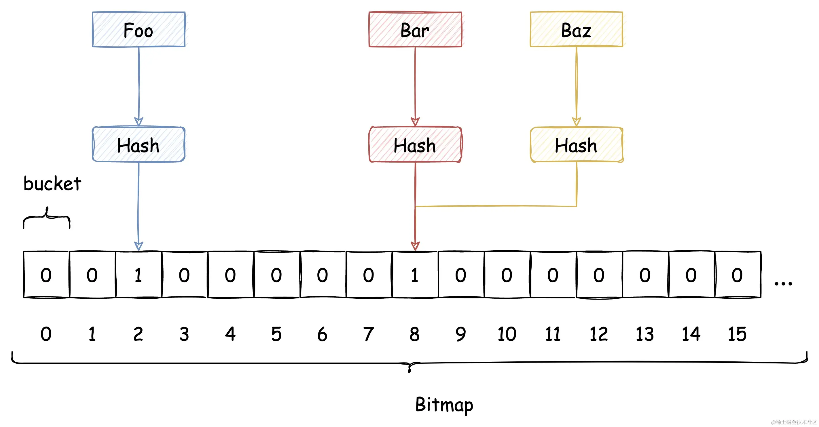 布隆过滤器的数据保存在 位图(Bitmap)上。Bitmap 简而言之是二进制位(bit)的数组。Hash Table 保存每个元素的位置,我们称之为 桶(bucket), Bitmap 上的每一位就是布隆过滤器的 bucket。